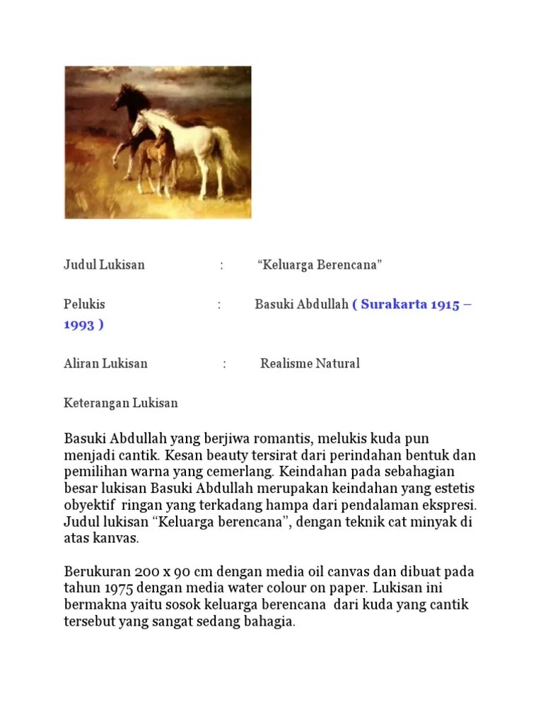 Seni lukisan merupakan seni yang memiliki pengertian yang dihasilkan seorang pelukis untuk menggambarkan sesuatu di balik kuas dan kanvas. Lukisan yang sebagian besar terdapat warna emas tersebut . Judul lukisan "keluarga berencana", dengan teknik cat minyak di atas . Membayangkan kehidupan keluarga yang terjadi pada setiap harinya; Bapak, ibu serta anak yang lain diletakkan di atas kursi ciptaannya. Lukisan semacam ini lebih banyak mencerminkan diri pelukisnya. Di dalam lukisan ini ada sebuah tengkorak yang oleh pelukisnya sengaja. Serta tanda tangan pelukis yang ada di salah satu gambar botol. 5.1 penangkapan diponegoro · 6 peringatan dan penghargaan · 7 galeri karya . Keindahan pada sebahagian besar lukisan basuki abdullah merupakan. Serta yang ketiga, anaknya yang merupakan kuda ukurannnya paling kecil. Pelukis yang memiliki nama lengkap sindudarsono sudjojono ini, dilahirkan di kisaran sumatera utara tahun 1913. Dikenal sebagai kakak pelukis indonesia lainnya, otto djaya, keduanya sejak kecil telah .